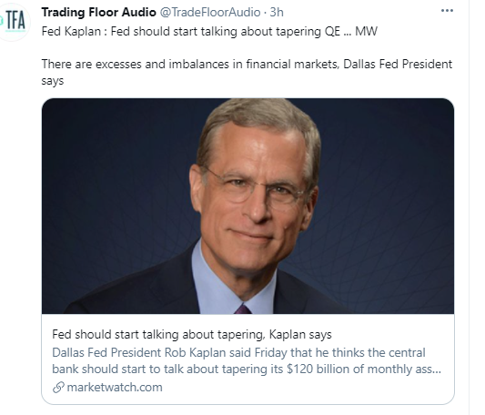 I've mentioned that one of the tricky things rest of the year is when and how the Fed introduces tapering discussion.  I've gone back and forth on whether they start way early (to try to tiptoe in) or way late (recognizing 2013 when markets jumped the gun).  One way to tiptoe would be to have the discussion sort of "seep up" from less influential to more influential members.  Kaplan is sort of the former, although influential enough that what he says is listened to.  Maybe this is the start of the tiptoe?